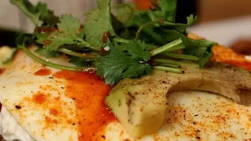 Roast 3 whole jalapenos over burners, on a grill or in the oven until blistered and beginning to get tender. Cook all 4 eggs sunny side up! Cut avocado into slices. Pick nice whole leaves of cilantro for garnishing your dish.